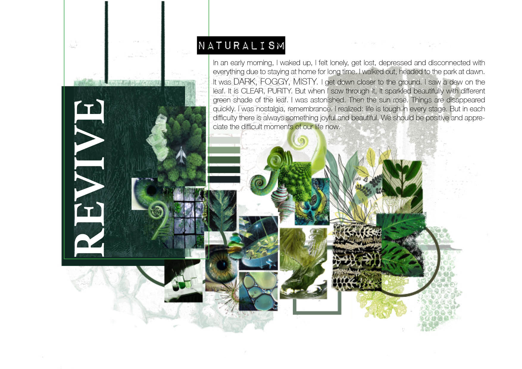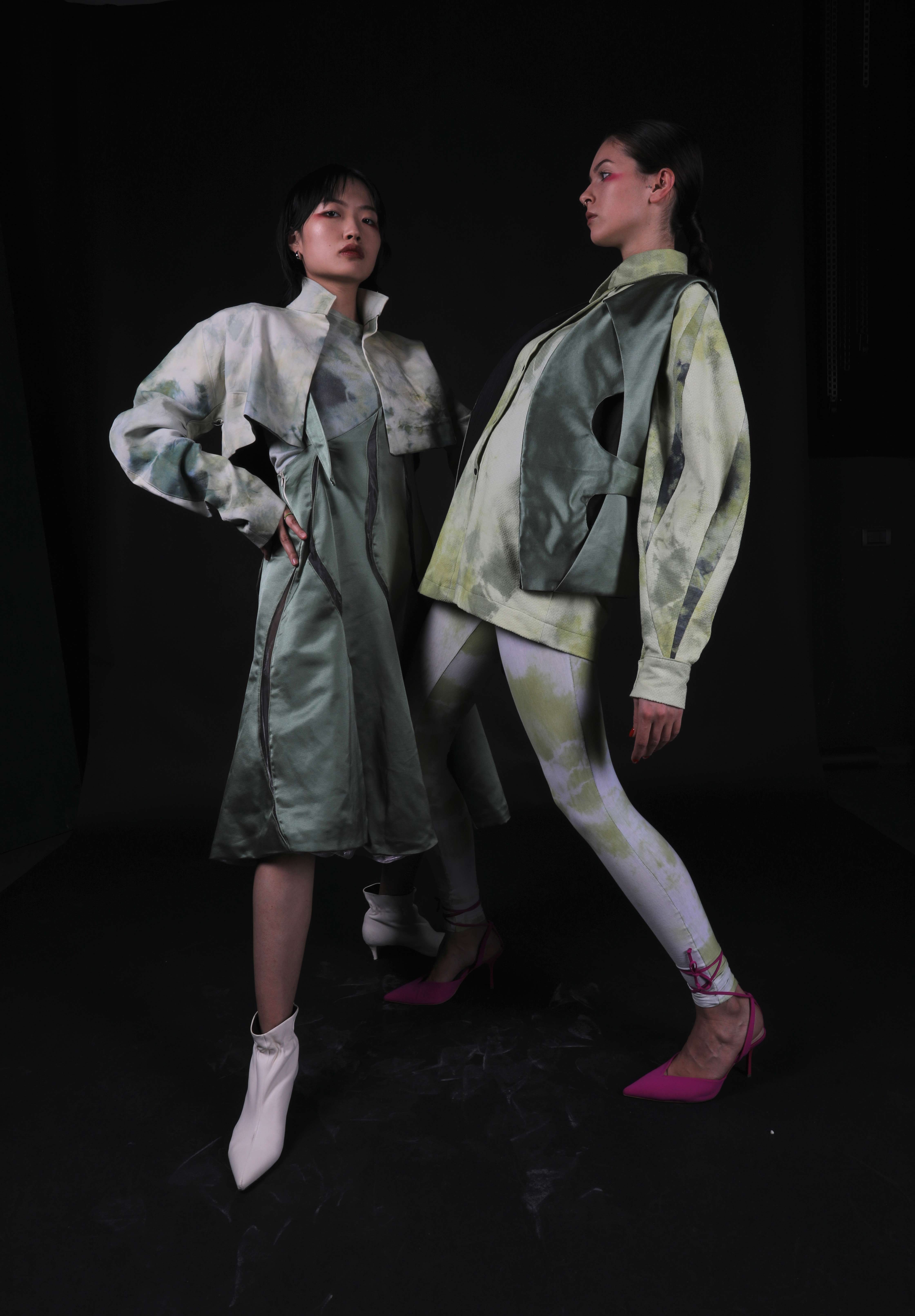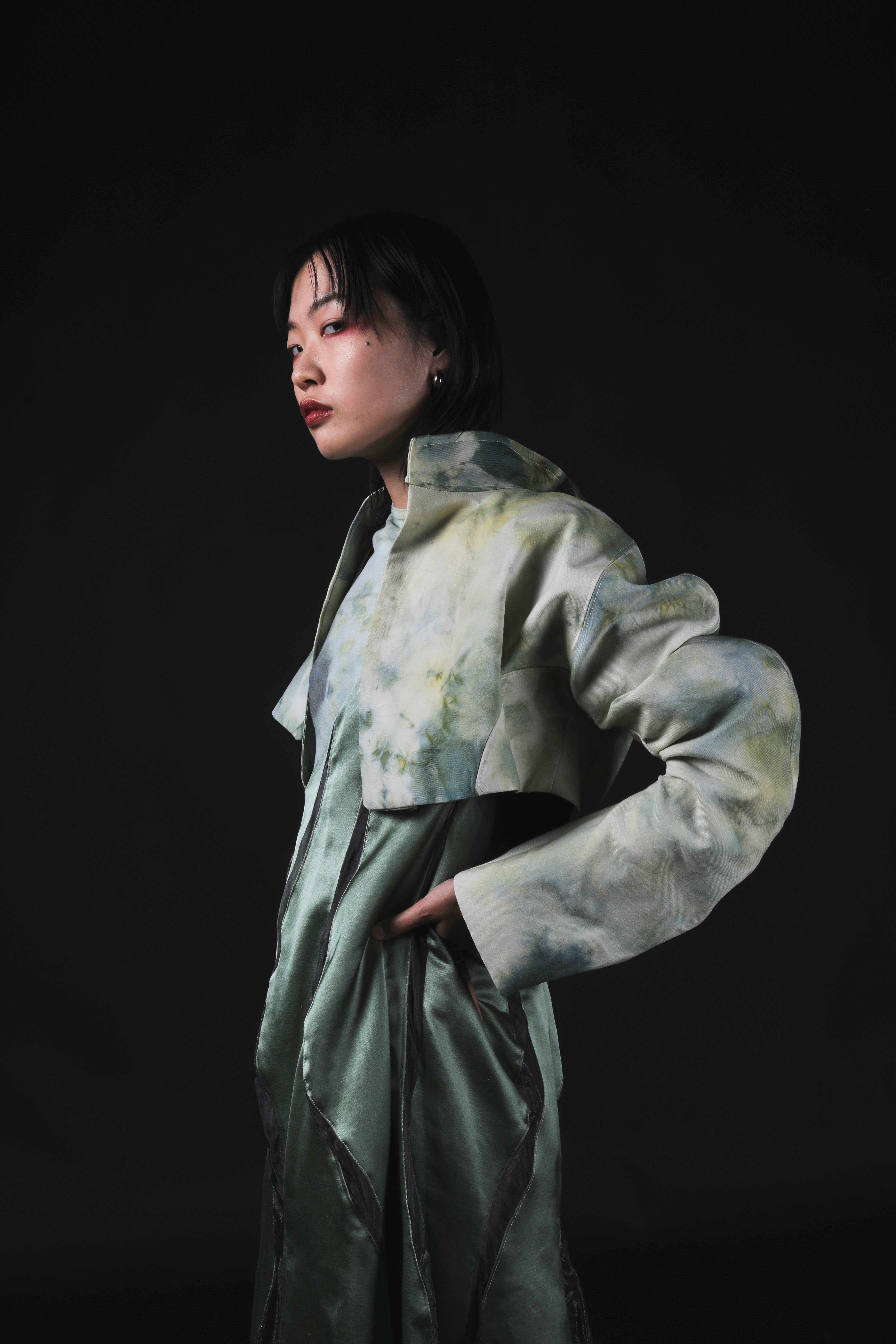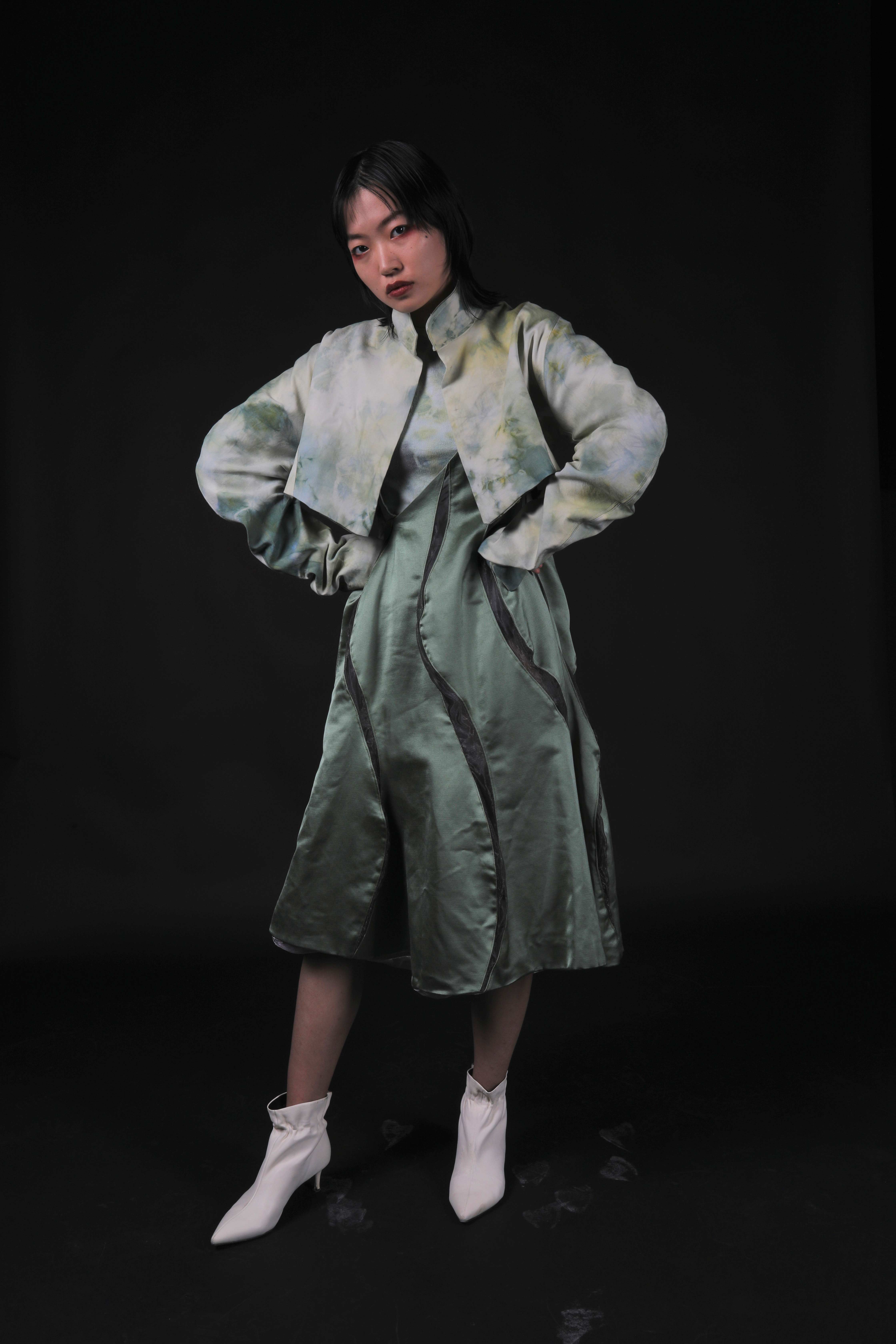 In the early morning, I waked up, I felt so lonely, depressed and disconnected with everything. I headed to the park at dawn. It was DARK, FOGGY, MISTY but the dew on the leaf was CLEAR and PURITY. I was astonished. Then the sun rose, things are vapored quickly. Life is tough in every stage. But there is always something joyful and beautiful. Be positive and appreciate the difficult moment of our life. The collection is the way I express my nostalgia, remembrance and darkness through the spiral pattern and tie-dye textiles.